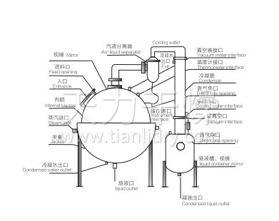 本设备主要由浓缩罐、冷凝器、气液分离器、冷却器、受液桶五个部分组成。浓缩罐为夹套结构,冷凝器为列管式、冷却器为盘管式。适用于制药、食品、化工等行业部门对液料的浓缩。并且也能回收酒精和简单的回流提取。